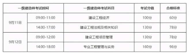 2021年一级建造师考试定于9月11日和12日举行。此考试时间为全国统一,一年仅安排一次。考试时间表如下: