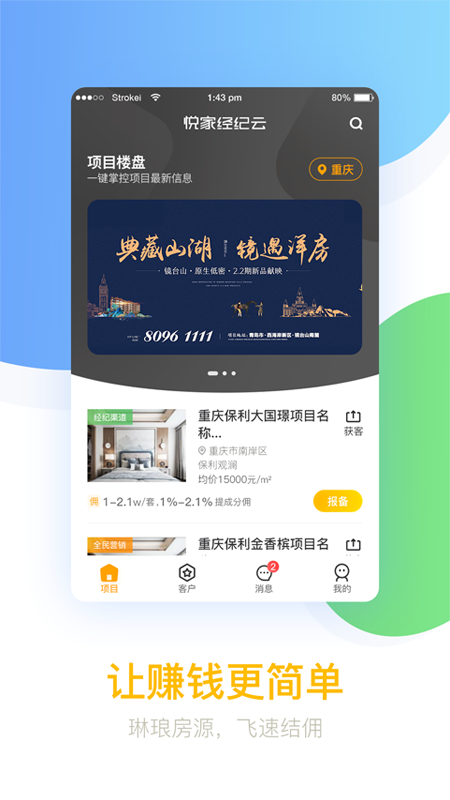 提供全国房源信息,用户可查看项目简介、楼盘卖点等详细信息,快速锁定目标客户;同时支持项目报备及查询楼盘报备历史。