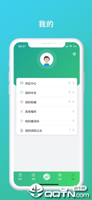 1、首先打开绿色青浦软件,进入后可切换至政务、服务、视听及我的页面,点击右下角的【我的】;