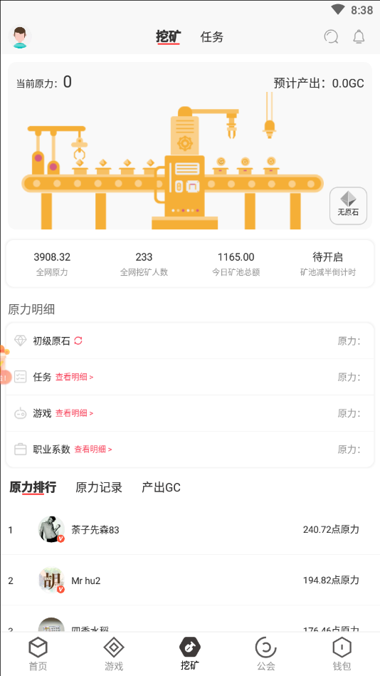 2. 点击挖矿,此时挖矿图标呈灰色,安装好原石(请务必安装原石,否则无法产出GC币),开启挖矿之旅。
