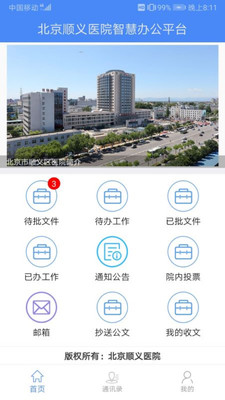北京顺义医院智慧平台,医疗移动办公软件。该平台支持办公数据系统的协同在线处理,提供线上文件审核,促进部门内部的沟通交流,助力医院数据流转更加迅捷、便利,提升医护人员的办公效率。