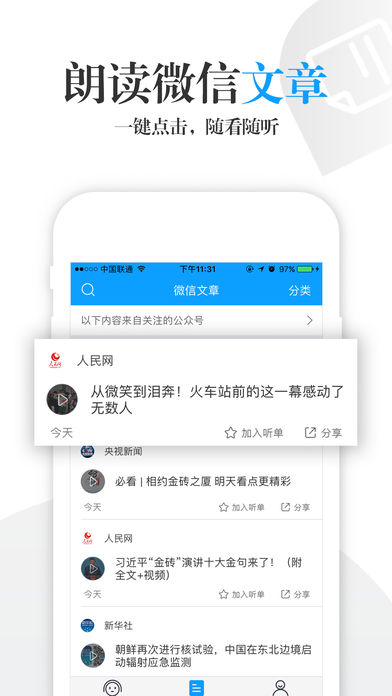 【听公共号】娱乐、新闻、情感、经济等十余类热门公共号文章,一键订阅,随时朗读;