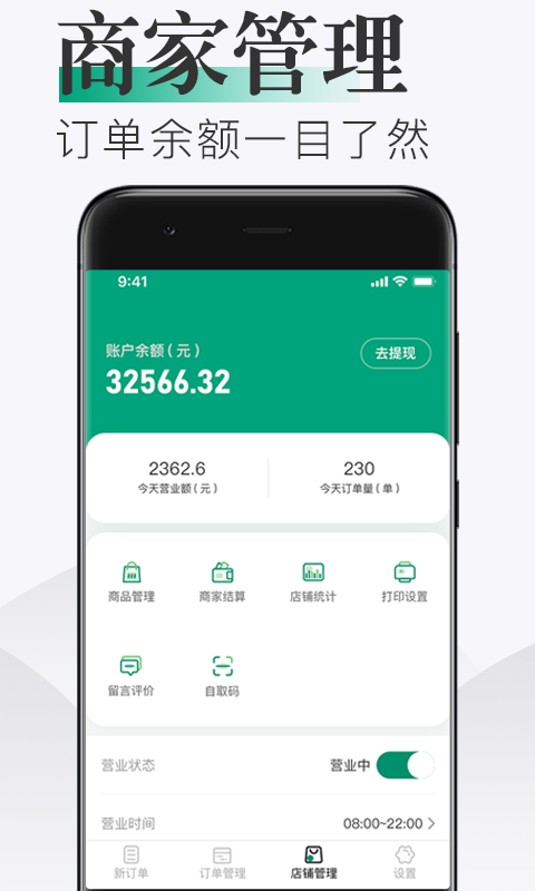 其主要功能包括接收与处理用户订单、催单、退款,进行在线账户结算与对账,以及门店管理,商家可随时调整营业信息及商品库存等。