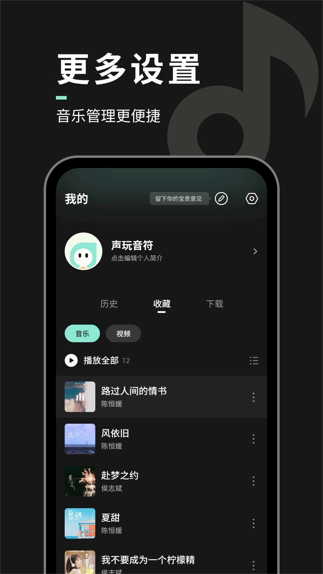 声玩音乐歌曲网站的官方网站手机版APP是一款免费的本地应用程序,具备音乐播放等多种功能,旨在为您推荐动听的旋律。其页面排版优雅,布局美观,功能齐全,带来更为舒适的听歌享受。