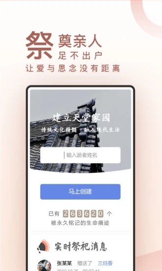 祭祀文化APP是一款倡导文明祭祀、致力于绿色环保的文化公益产品,为用户提供网上建立纪念馆、网上祭祀、网上灵堂、网上公墓及网上扫墓等服务,使哀思得以寄托,让生命事迹得以永恒传承!