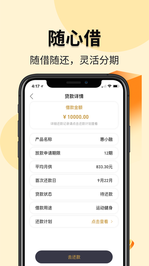 惠小融贷款专注于线上现金分期借款服务,为用户创造安全、便捷、快速的借款体验,借钱变得更加轻松!