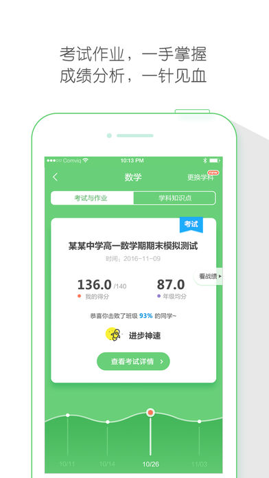 3,学科学习动态一目了然:及时掌握学习成绩的走势,更深入了解自己当前的学习状态,包括每个知识点的掌握情况。