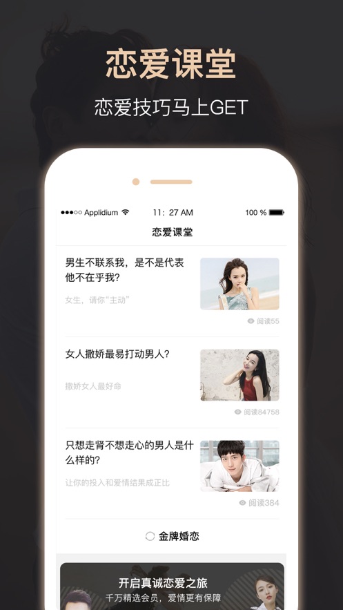 1. 金牌婚恋软件聚集了全国各地高素质的单身男女,以婚恋为目标开展交友活动;