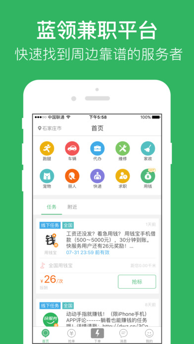 你只需下载一个快服务APP即可一站式解决生活中的各种找人帮忙服务问题,快服务致力于成为本地的淘宝。