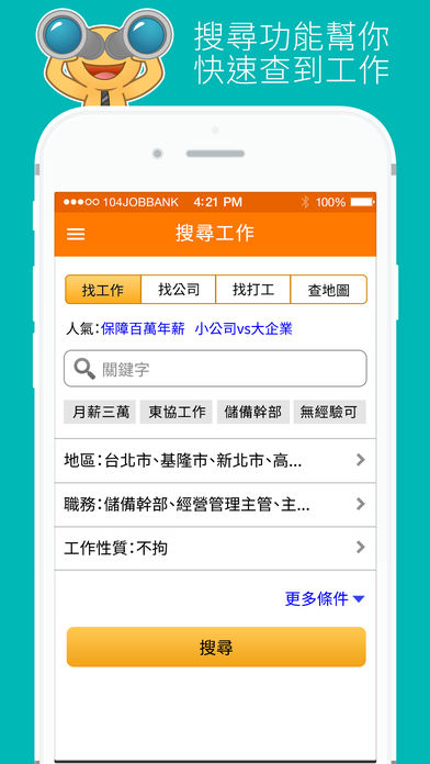 104人力银行为您提供卓越的手机应用服务,让您随时随地轻松寻找工作!