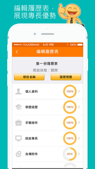 - 随时在「104工作快找」中编辑和完善您的简历。