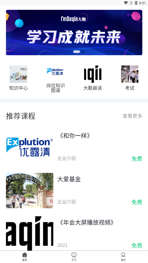 大勤商学院是一款旨在提升企业内部员工素质的培训软件,用户可随时随地通过视频、图文等多种形式学习,助力个人成长;完成课程学习后,亦可通过相应的测试进行自我评估与巩固。