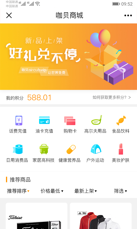 话费充值、购物卡、充值、高尔夫用品、食品饮料。