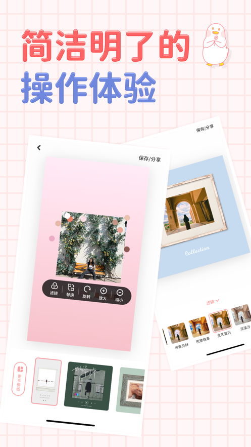 鸭app是一款专注于拼图滤镜创作的工具,软件内置丰富多样的拼图模板,拥有众多少女心滤镜,以及多种尺寸调节功能,旨在为用户带来无与伦比的拼图享受。