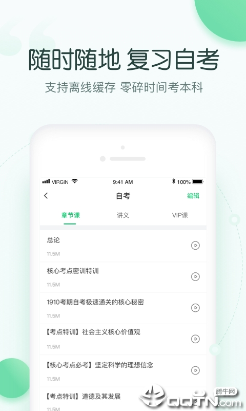 - 随时随地复习自考,支持缓存,利用零碎时间攻克本科;