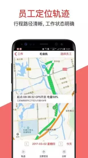 工作轨迹:实时定位外勤员工,随时掌握工作轨迹,行程尽在指尖。