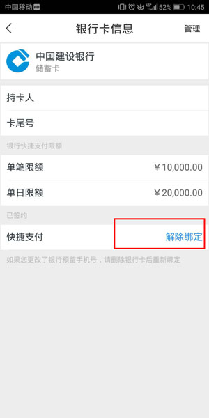 4、点击银行卡图标后,具体的银行卡信息将显示,包括持卡人、卡号等,右下角有【解除绑定】的标志,点击【解除绑定】以进入下一步。