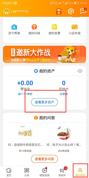 1、首先点击手机上的苏宁易购app进入,右下角有个【我的易购】图标,拉到中间找到【查看更多资产】图标,点击进入。