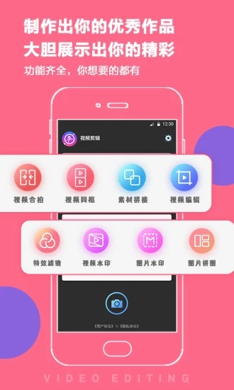 这是一款专业的视频编辑与剪辑工具,专注于视频创作,涵盖自拍、素材合并、视频同框、视频拼接及特效滤镜等高清剪辑功能,能够为视频增添多样的水印与边框,操作简便,功能强大!