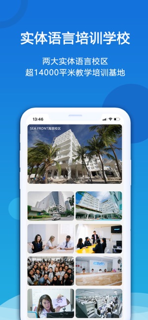 1、实体语言培训学校:两大实体语言校区,超14000平米的教学培训基地。