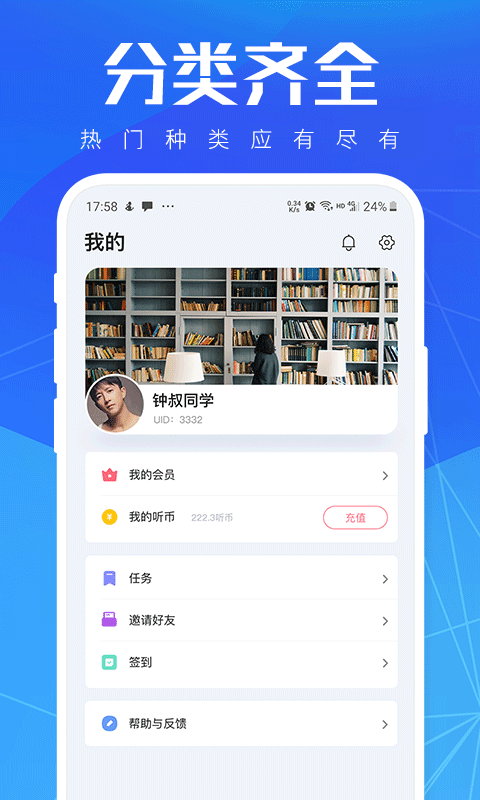 - 近20个精彩分类频道,海量有声资源,畅听无极限!