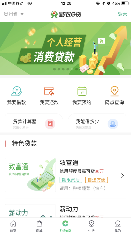 5.融合黔农e贷,支持线上贷款、自助还款、预约贷款等功能。