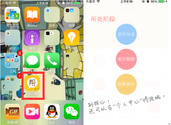 1:在手机app中搜索“会计帮”,然后下载安装。安装完成后打开软件,选择所处的阶段,该项可以在“个人中心”修改。