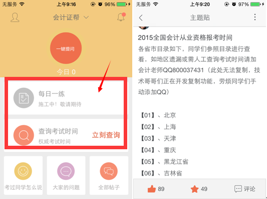 4:点击“每日一练”可以做题,随机抽取题目;点击“查询考试时间”,可以跳转到报考时间查询帖子,查询相关报考信息。