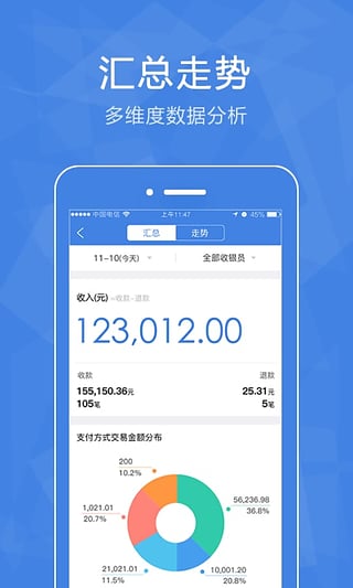 数据全面,实时监控:收款数据、退款数据各类数据实时分析。