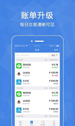 一键收款,告别现金:微信、支付宝钱包、手机QQ多种收款方式。