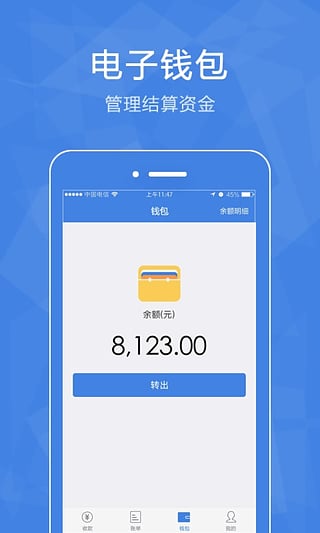 【钱包】电子钱包,开通后每日结算资金自动结算至钱包中,可一键转出至绑定实体卡,未来可享受多重增值服务。