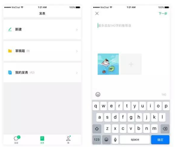 -便捷创作:在编辑图文消息时,可一键添加图片和音乐;也可以快速地发布图片和文字消息。没有及时发出的图文消息,可以存储在草稿箱里。
