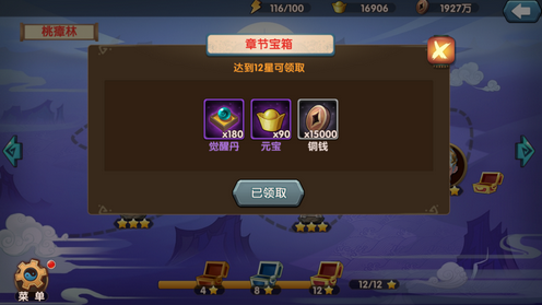 每章根据获得的星数达到一定熟练度可开启宝箱,每一章包含铜宝箱、银宝箱、金宝箱各一个,宝箱中含有:元宝、觉醒丹、铜钱。