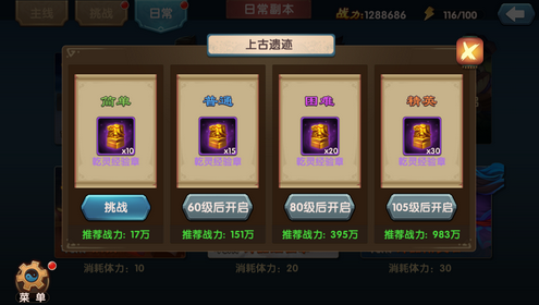 每个日常副本有四个难度,需达到一定等级方可挑战。