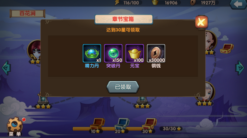 二:通关章节,可领取通关宝箱,其中包含元神、突破丹、铜钱。
