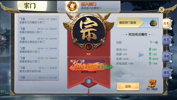 加入宗门后,您将根据宗门等级获得战力加成。建筑等级越高,宗门成员的属性加成将越显著!