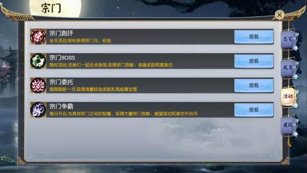 通过点击活动即可查看宗门的各类活动,日常活动和限时活动均可参与,丰厚的宗门贡献、经验和极品奖励在等待着你!
