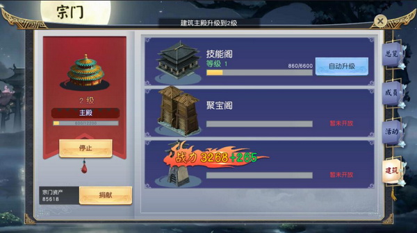 点击建筑可以查看当前宗门建筑等级,通过宗门任务获得的宗门令可在此捐献,以获得宗门贡献,同时提升宗门建筑等级。建筑每升一级,宗门成员的属性也将随之提升!