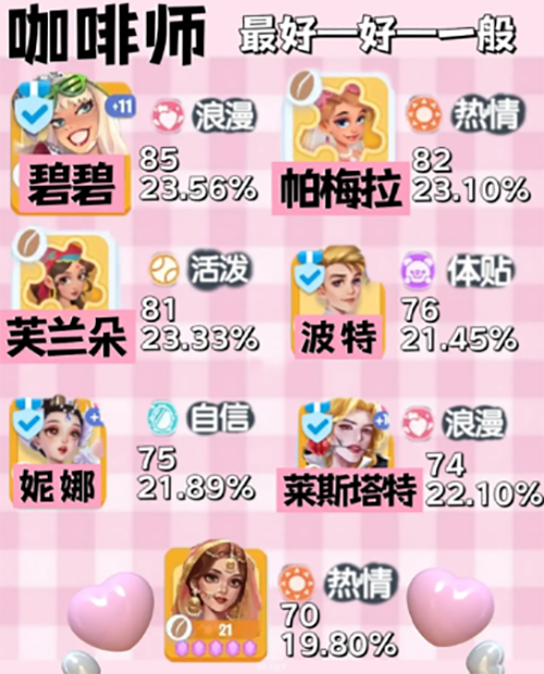 目前最佳选择看起来是由热情组合、茶艺师组合、自信组合提供的8个员工(以厨艺较高的选择)为主,再加上组合相同,以有核心buff的职员为主,其他做辅。
