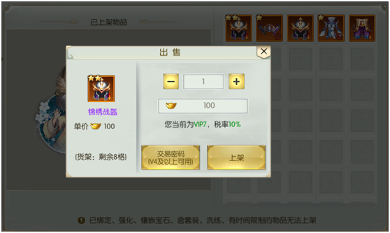 VIP4及以上玩家可设置6位数的交易密码,买家输入正确密码方可购买物品