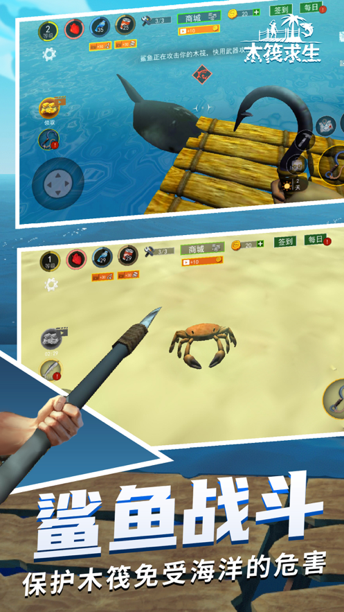 1、很惊险的木筏求生场面,玩家们享受在孤岛的新颖感觉,但是独自一人在孤岛中生存会遇到各种各样的困难