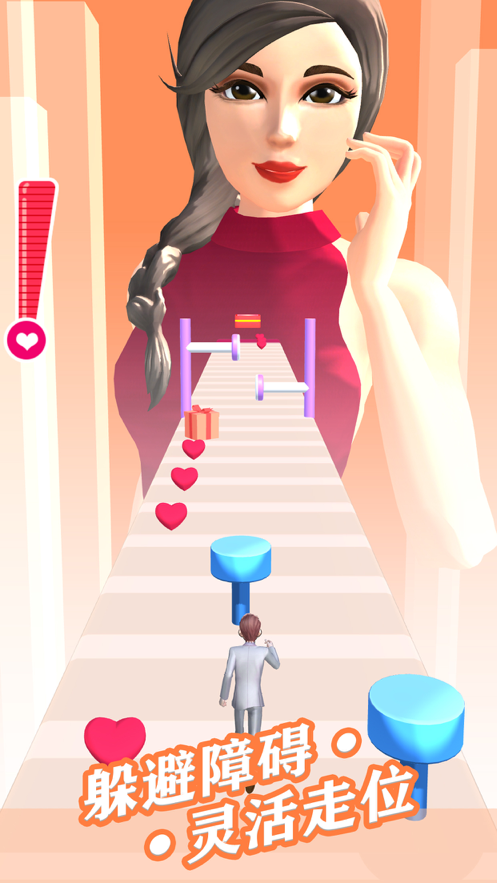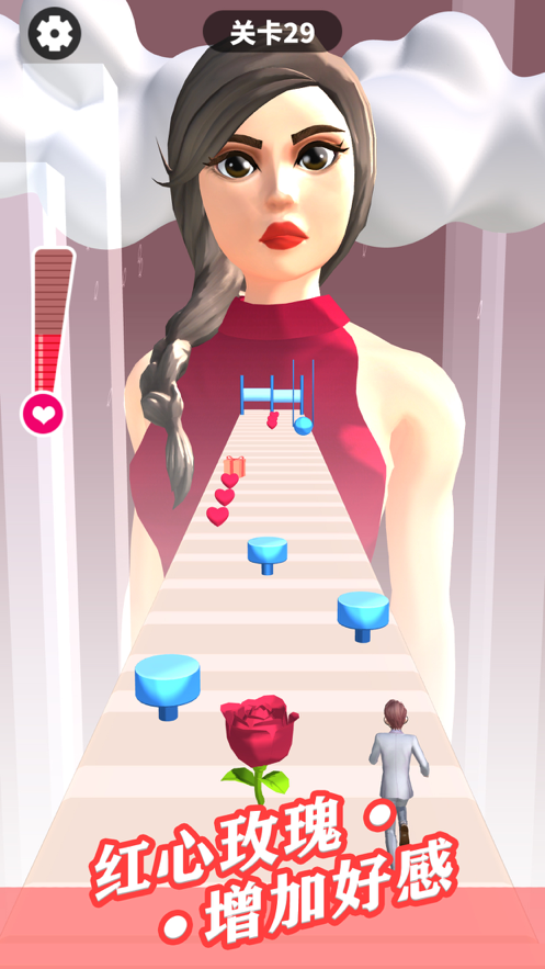 3、跑酷途中会出现玫瑰与红心,填充进度条以增进女神的好感,红心不断增长,最终赢得女神的青睐,求爱成功。
