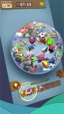 匹配三重是一款独具特色的消除类游戏,采用了立体的3D画风。在一个巨大的气泡之中,蕴藏着众多相同的物品,玩家需要将它们消除,气泡便会随之消散。