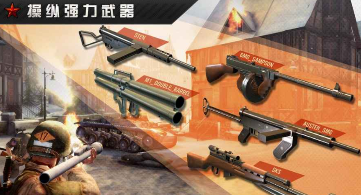 3、强力武器,任君选择,机关枪、狙击枪、火箭筒、火焰喷射器,定会让您眼花缭乱!不断扩充军火库,消灭邪恶纳粹,指引盟军走向胜利!
