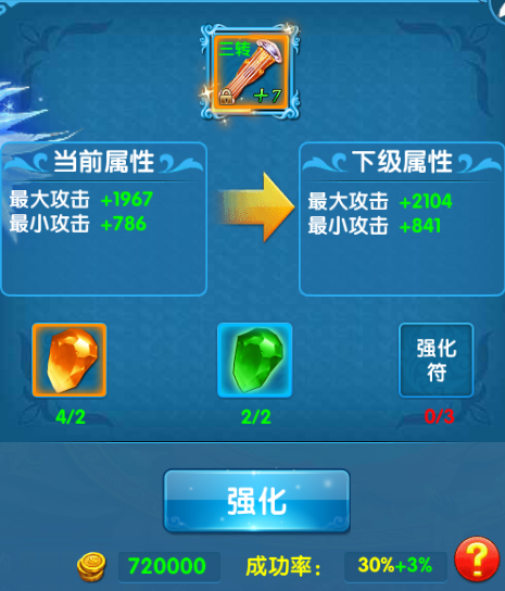 顾名思义,强化系统可直接提升装备属性,玩家通过消耗低级与高级强化石来提升装备的强化等级,等级越高,装备属性愈加强大。然而,强化等级提高的同时,成功的难度也随之增加,伴随着失败的风险。