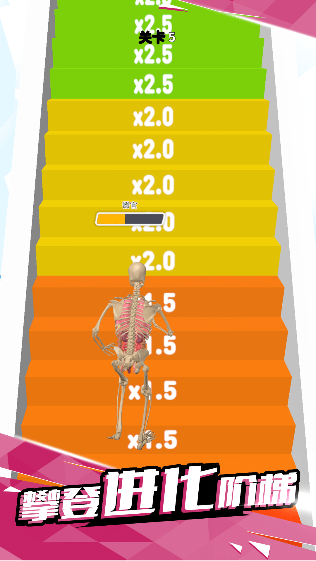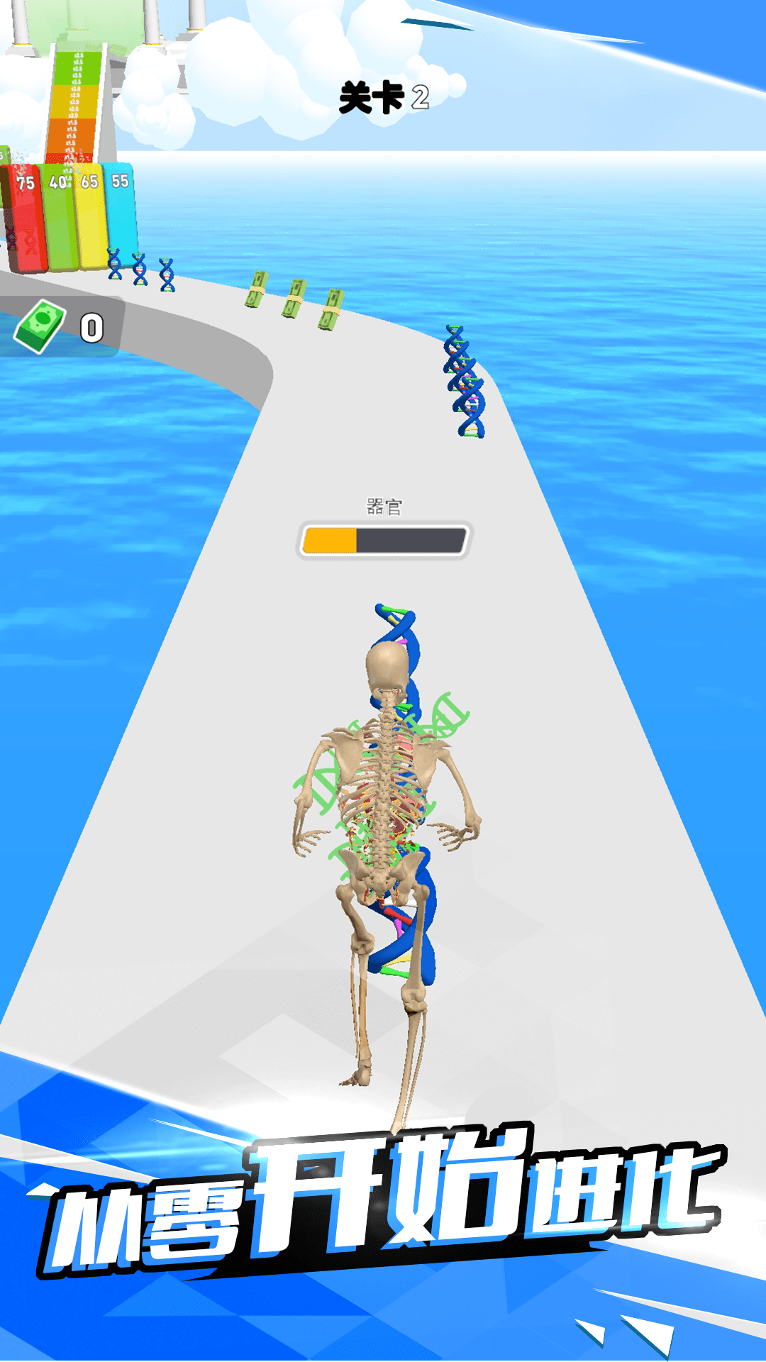 一款非常有趣的休闲类竖版小游戏,新奇的画风不经让玩家跃跃欲试。玩家需要在奔跑中地图上的DNA来不断充实自己,一开始的人物只是一具骷髅,但随着玩家的分数越来越高,人物逐渐变成了有血有肉的真人。游戏支持操作,游玩门槛极低,适合所有人游玩。