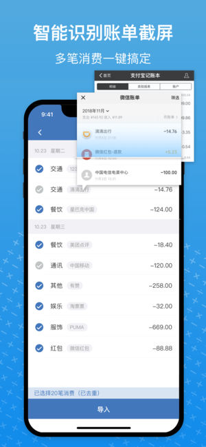 只需导入账单截图或拍摄照片,即可轻松完成自动记账;