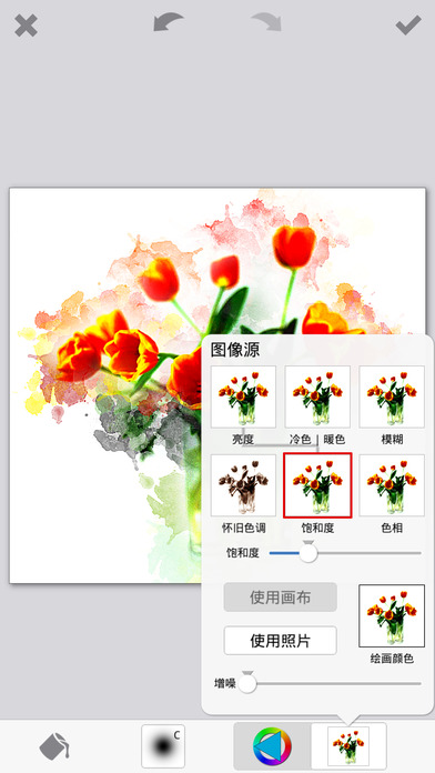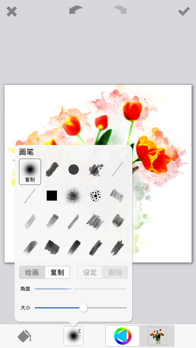 笔刷能够随触屏的方向移动,亦可根据个人需求设定笔刷的角度。您还可随时调整画笔的色相、饱和度与模糊度。