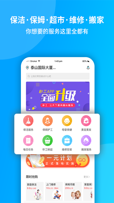 秒工APP是一款解决生活需求的服务软件,让你花最少的钱,享受随叫随到的服务!
