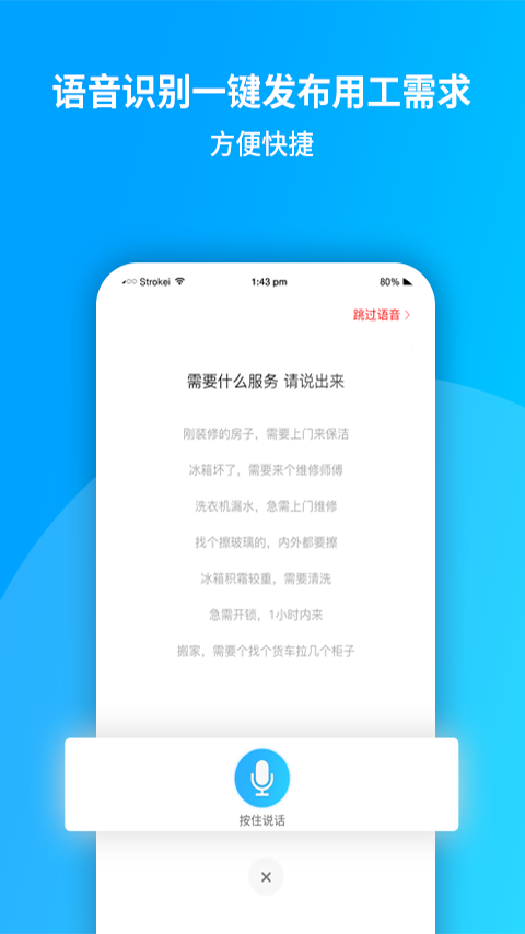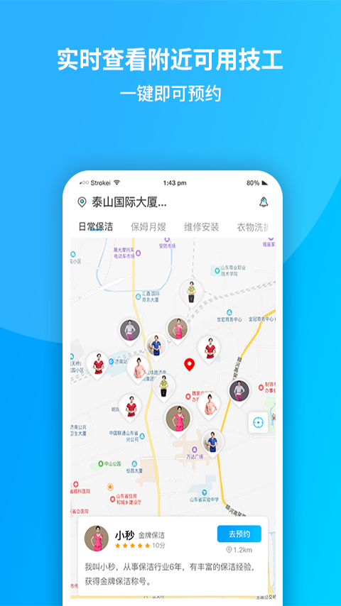 秒工App,保洁·保姆·超市·维修·搬家,你想要的服务这里全都有;实时查看附近可用技工,一键即可预约;语音识别一键发布用工需求,方便快捷。